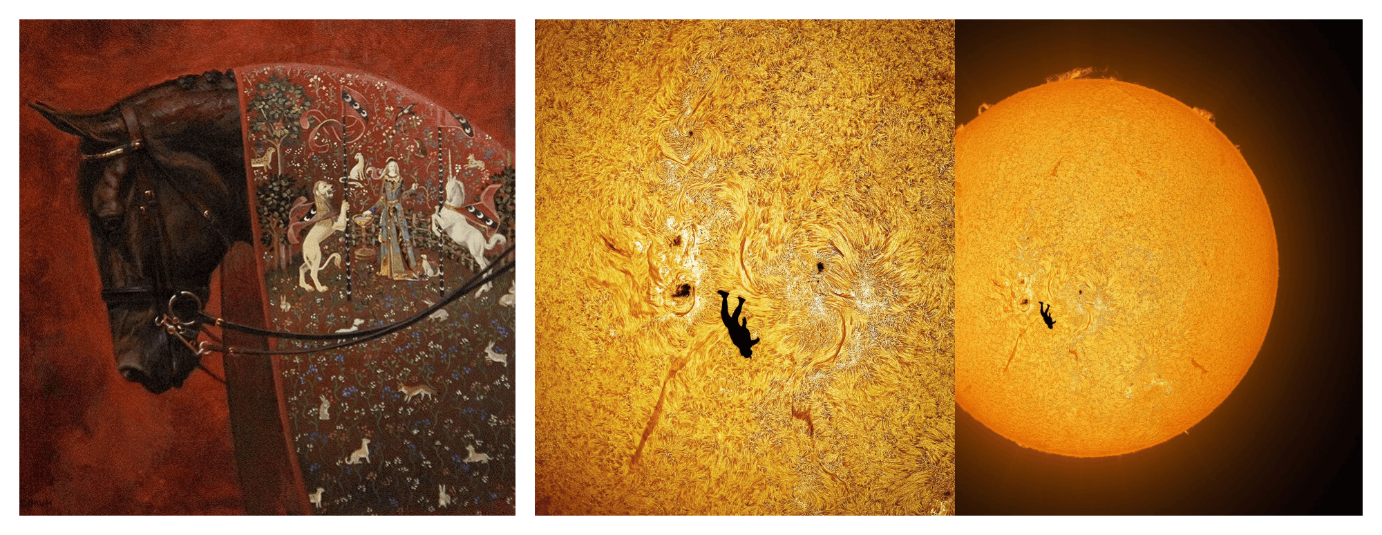 Non AI Art: [Left] The Red Tapestry by Jaime Corum [Right] The Fall of Icarus by Andrew McCarthy